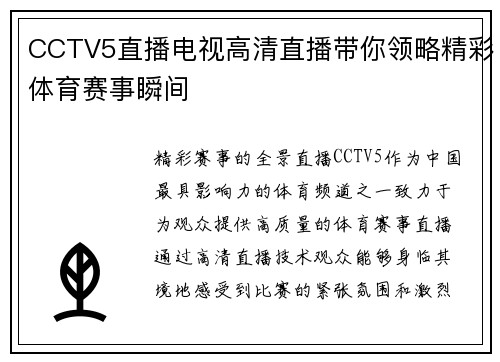 CCTV5作为中国最具影响力的体育频道之一,致力于为观众提供高质量的体育赛事直播。通过高清直播技术,观众能够身临其境地感受到比赛的紧张氛围和激烈竞争。无论是足球、篮球、乒乓球还是田径赛事,CCTV5都能以清晰的画面和专业的解说,带领观众领略每一个精彩瞬间。本文将从赛事直播的技术优势、赛事解说的专业性、观众互动的多样性以及赛事回顾的全面性四个方面,详细探讨CCTV5如何通过高清直播为观众呈现精彩的体育赛事。